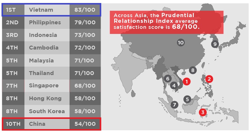保誠保險公布的2016年保誠人際關(guān)系指數(shù)顯示,亞洲人對人際關(guān)系的總體滿意度較高,為68%。亞洲十個國家和地區(qū)中,越南受訪者對人際關(guān)系的滿意度最高,為83分,其次分別是菲律賓和印度尼西亞。中國得分最低,僅54分。另外,人們最容易因金錢、孩子以及缺乏關(guān)注等問題產(chǎn)生爭執(zhí)。(美通社,2017年2月9日香港)