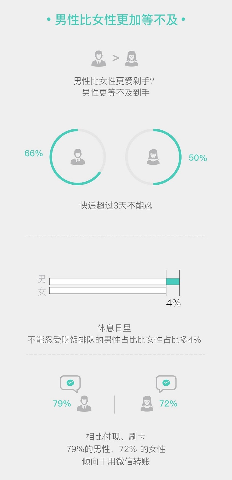 另外,綜合來看,相比于女性消費(fèi)者,男性消費(fèi)者更加不耐煩。