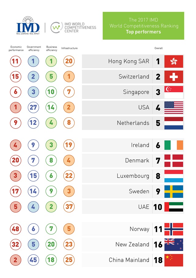 由 IMD(瑞士洛桑國際管理發展學院)世界競爭力中心編纂的年度排行榜中,香港鞏固了其主導地位,連續第二年位居榜首。瑞士和新加坡分列第2名和第3名,美國則由去年的第3名下滑至第4名,創造了五年來的最低排名。前五名還包括荷蘭 -- 由去年的第8名躍升至第5名。中國大陸今年上升了7個名次,排在第18名。今年,IMD 世界競爭力中心首次單獨發布了一份關于國家/地區數字競爭力排名的報告,排在前幾位的依次是新加坡、瑞典、美國、芬蘭和丹麥。(美通社,2017年6月1日瑞士洛桑)