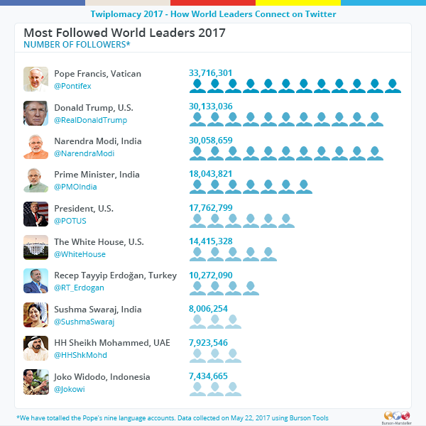 博雅公關的年度“推特外交”研究顯示,教皇方濟各是推特上最多人關注的世界領袖,粉絲數超3371萬,領先于美國總統特朗普的3013萬。排在第三位的是印度總理莫迪,粉絲數為3005萬。全球178個國家的276位政府首腦、外長都在使用推特,超過Facebook,后者僅有169位政府首腦在其網站上開設了專頁。但是,關注領導人Facebook專頁的粉絲數量平均是Twitter的兩倍。特朗普是少有的自己打理推特賬號的領導人之一,過去12個月,他的推特共產生1.66億次互動,約是印度總理莫迪的5倍。特朗普也是推特是被提及次數最多的領導人。(美通社,2017年5月31日紐約)