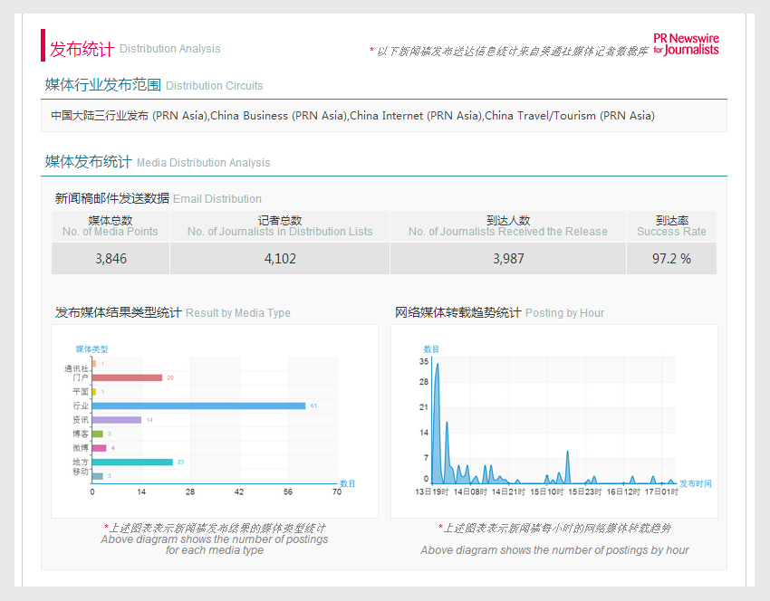 a、對新聞稿郵件在24小時內的發送數據進行統計,包括在美通社PRNJ媒體數據庫中發布所覆蓋的媒體數量、記者數量,方便客戶直觀了解稿件發送的媒體覆蓋與到達情況。