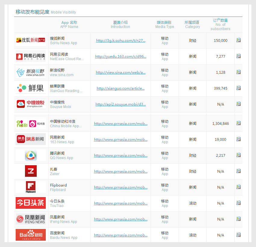 d、“移動媒體能見度”(Mobile Visibility)新增對每個移動端(App)的訂戶數量、發布頻道進行展示呈現,幫助客戶了解及定位查詢新聞稿在移動端的發布情況。