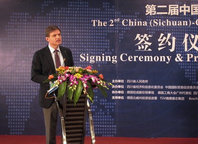 四川成都2011年10月18日電 /美通社亞洲/ -- 繼2010年TUV 南德意志集團(以下簡稱TUV SUD )在第一屆洽談會中代表德方企業與四川省機械研究設計院和四川省機械行業委員會簽訂技術合作諒解備忘錄之后,中德(四川)第二屆機械合作洽談會在成都凱賓斯基酒店隆重開幕。TUV SUD 大中華集團總裁& CEO 范華德(Dirk von Wahl)先生蒞臨會議現場并發言。