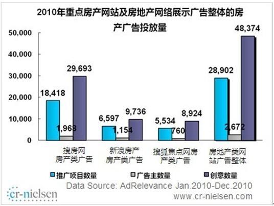 北京2011年2月9日電 /美通社亞洲/ -- CR-Nielsen(尼爾森互聯網研究)《2010年中國房地產網絡展示廣告市場研究項目報告》(以下簡稱報告)顯示,2010年中國房地產網絡展示廣告市場呈持續增長態勢,廣告推廣項目、廣告主數、創意數相比2009年均有穩健增長。搜房網在這三個核心考核指標中以六成以上的比例高居榜首,其中在房產類廣告主指標上優勢顯著,行業占比高達73.7%。