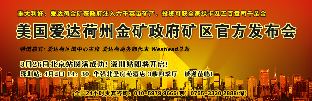 北京2011年3月29日電 /美通社亞洲/ -- 世通(北京)出入境有限公司將于2011年4月2日14:30在深圳舉辦美國投資移民精品項目-美國愛達荷州金礦項目發布會。