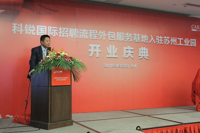 蘇州2011年4月25日電 /美通社亞洲/ -- 2011年4月22日,亞洲領(lǐng)先的整體招聘解決方案提供商 -- 科銳國(guó)際人力資源有限公司(簡(jiǎn)稱“科銳國(guó)際”)在蘇州獨(dú)墅湖會(huì)議酒店舉行“招聘流程外包服務(wù)基地”入駐蘇州工業(yè)園慶典儀式,正式宣布將以蘇州工業(yè)園區(qū)為核心,打造輻射長(zhǎng)三角乃至全國(guó)范圍的人力資源外包服務(wù)示范中心。作為首家落戶園區(qū)的招聘流程外包服務(wù)基地,今后,基地將緊密圍繞國(guó)家及蘇州工業(yè)園區(qū)服務(wù)外包產(chǎn)業(yè)“十二五”規(guī)劃,為科銳國(guó)際海內(nèi)外大型招聘項(xiàng)目提供人才尋訪支持,助力優(yōu)化企業(yè)人才較佳配置結(jié)構(gòu),并為蘇州工業(yè)園區(qū)打造“中國(guó)服務(wù)外包第一園”戰(zhàn)略目標(biāo)貢獻(xiàn)力量。