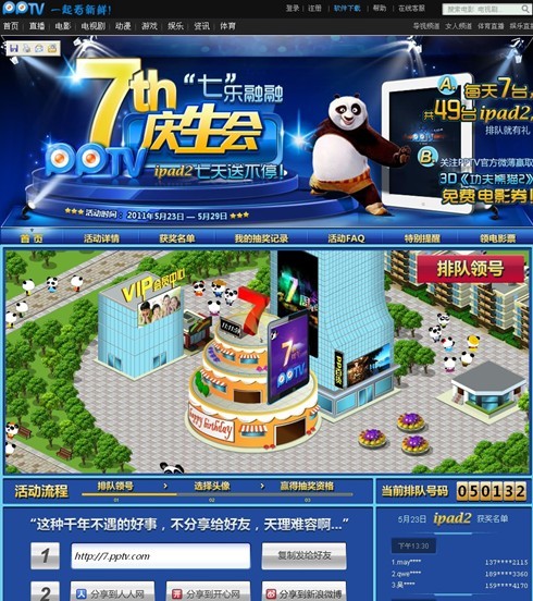 PPTV 網(wǎng)絡(luò)電視七周年慶生活動(dòng)首頁(yè)(截止到2011年5月23日晚10點(diǎn))