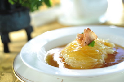 以傳統(tǒng)粵菜配合美景的中餐廳君綽軒,更為賓客締造味覺(jué)、視覺(jué)同享的品賞盛宴,圖為菜膽肘子片燉鮑翅