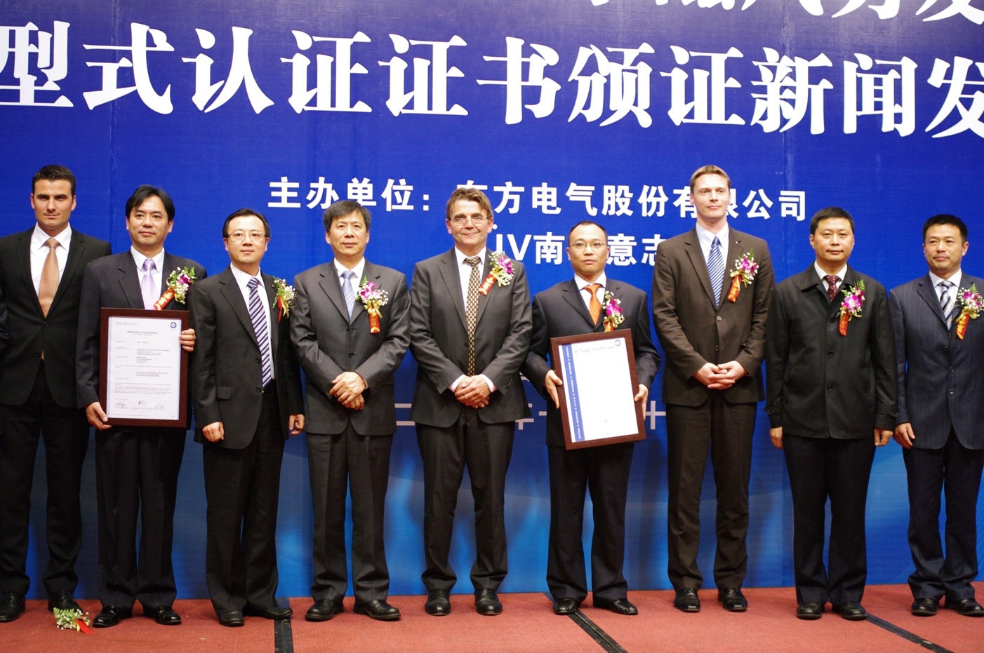 2011年10月20日,東方電氣集團東方電機有限公司獨資子公司東方電氣新能源設備(杭州)有限公司公司(以下簡稱“新能源公司”)生產的DF82-1500直驅永磁風力發電機組通過TUV 南德意志集團(以下簡稱“TUV SUD”)按照 GL 導則進行的 A 級設計評估和型式認證,頒證儀式在北京國際風能大會暨展覽會期間舉行。TUV 南德意志集團風能部經理 Martin Webhofer博士和 TUV SUD大中華集團副總裁Wolfgang Hübl先生在儀式中分別向新能源公司技術開發部部長鄭北超先生及新能源公司總經理詹明先生頒發了設計認證和型式認證證書。TUV SUD 大中華集團高級副總裁金燦先生、TUV SUD風能部總經理Ernst Donislreiter先生、東方電氣集團黨組成員、副總經理朱元巢先生、東方電氣集團東方電機有限公司總經理賀建華先生、東方電機有限公司副總經理、新能源公司董事長蘭向軍先生等出席并且見證了本次儀式。