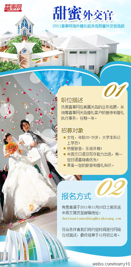 婚禮是每個人一生中最幸福的時刻,海外婚禮更是無數新人夢寐以求的最甜蜜的夢想,而如此令人向往的海外婚禮是需要多么精心的打造,通過一則甜蜜的招聘啟事或許可以找到答案。