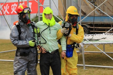 整場演習的大部分環節由梅思安(MSA)安全培訓中心承辦,梅思安(MSA) 安全培訓中心經理孫健先生擔任此次演練的總策劃及現場解說員。整個演練共分四個部分,首先開始的是“密閉空間應急救援”配備了正壓式長管供氣呼吸器的隊員 在其他隊友的協助下,通過營救單元的滑輪繩索,快速下降到罐底,為被救者套上正壓式緊急呼吸器的頭罩施救,并利用營救單元的滑輪繩索施救。 接下來“救援技術展示及高空救援演練”詳細展示了表演了高空救援的救援技術。第三科目為化學氣體泄漏逃生及應急救援演練。救援隊員利用了先進的熱成像儀進 行搜索發現了中毒者倒地的地點,利用所帶正壓式呼吸器他救功能救出被救者。隊員利用 MSA BD2100 一分鐘快充功能,可以立刻相互充氣,確保任務完成。而最后一部分上海石化消防支隊開展了精彩的消防演習。