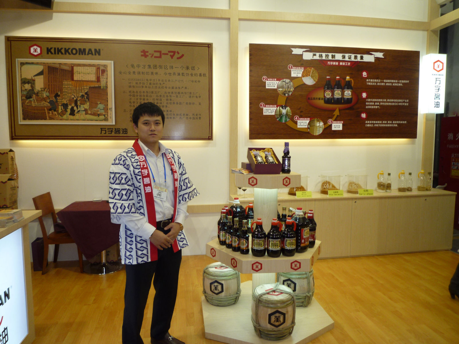 悠久的歷史和天然純釀造的高品質是萬字醬油特色。萬字醬油不僅僅在日本,還在全世界暢銷。而這產品的暢銷秘訣可在龜甲萬公司的展臺里得到啟示。