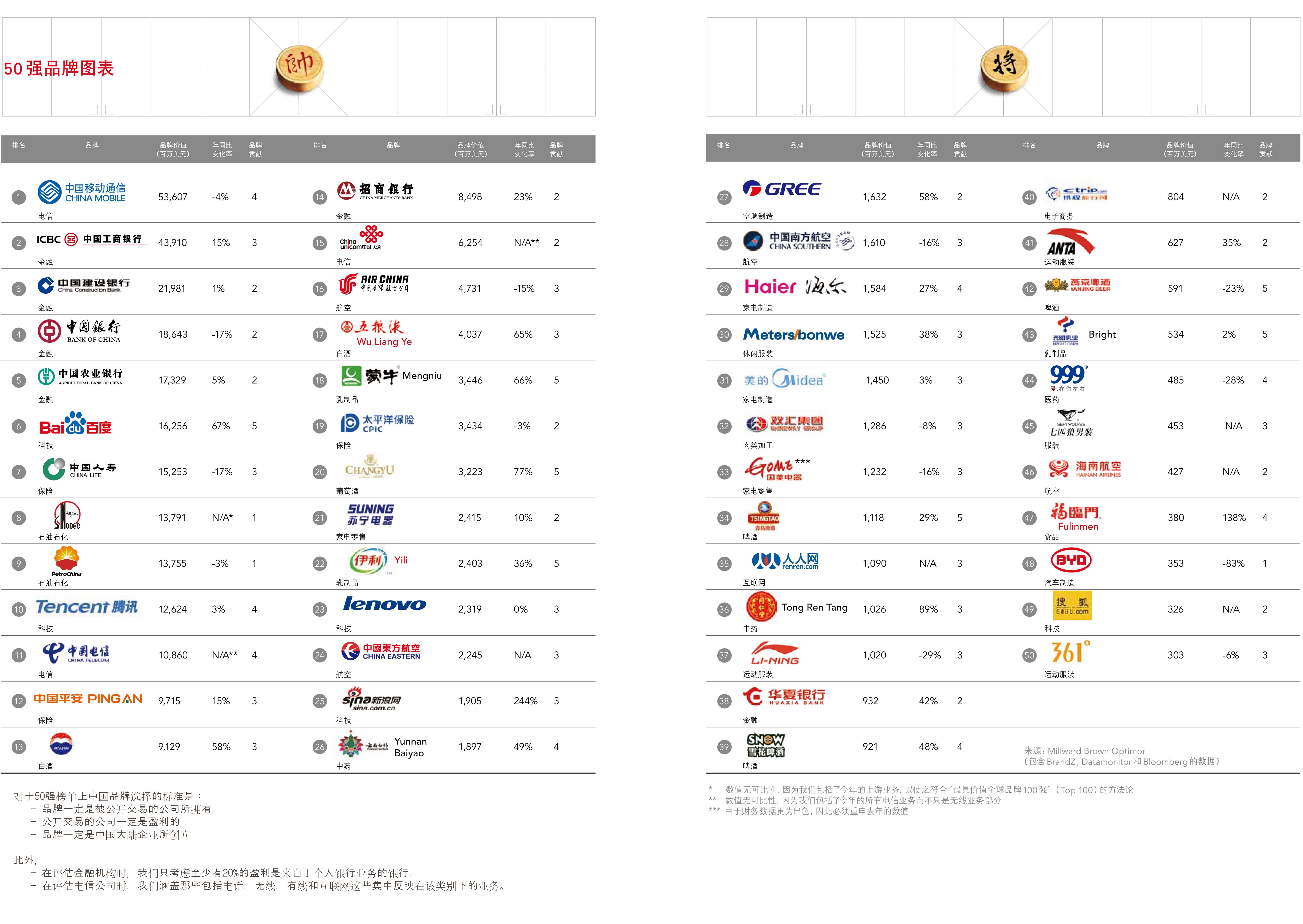 BrandZ? 最具價值中國品牌50強排行榜是由 Millward Brown 公司為 WPP 旗下運營公司執行的研究項目。此項目是唯一結合了數據超過35,000名中國消費者的調查的品牌資產與對每家公司的財務及經營成果的嚴格分析(數據來自 Bloomberg 和 KantarWorldpanel)的研究調查,分隔品牌在推動品牌業務收入及資本市場的價值。