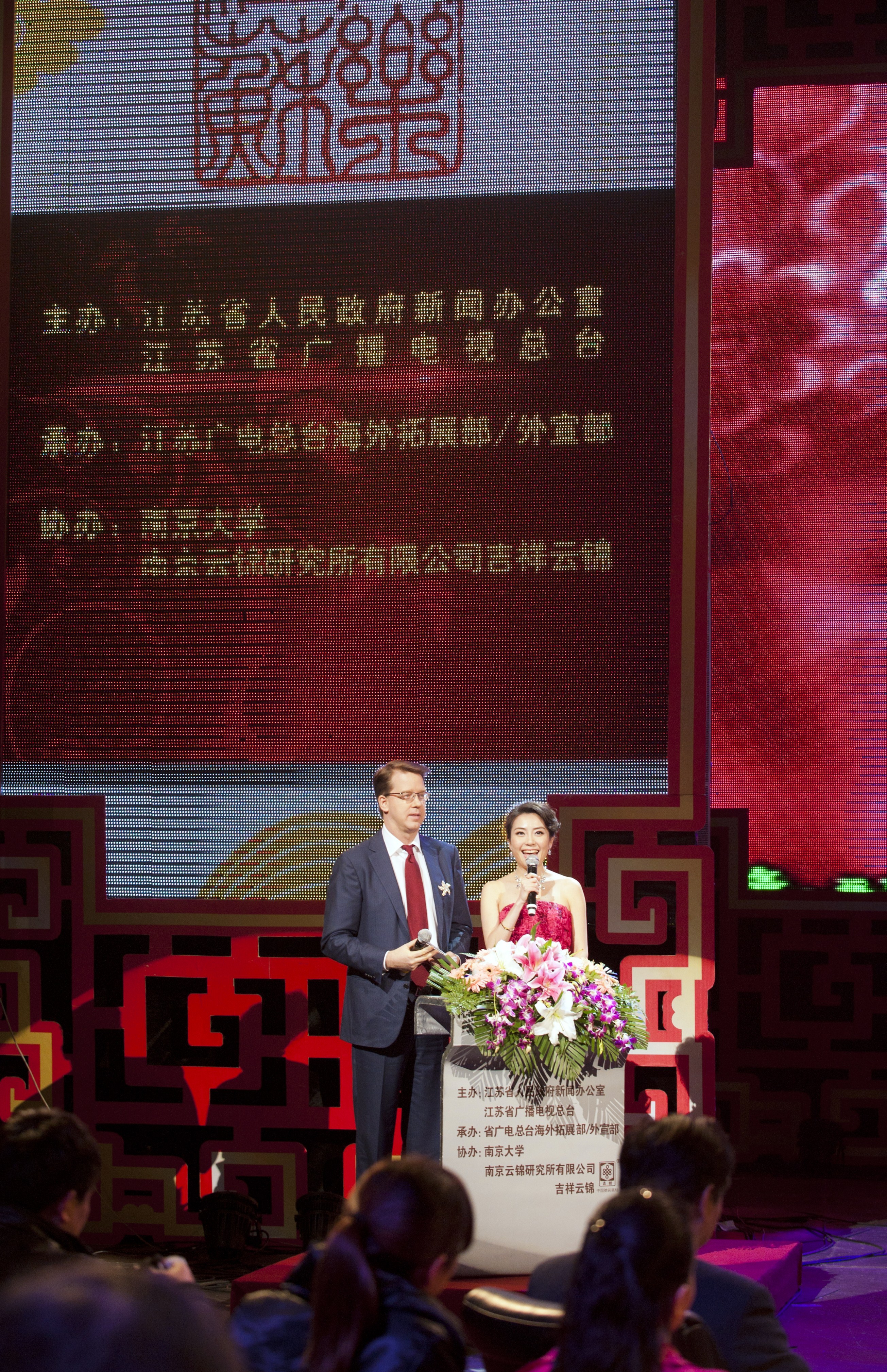 億亮傳媒集團董事總經理 Mark Hammons(左)和江蘇電視臺主持人王玨(右)在才藝秀上問候滿座的觀眾。