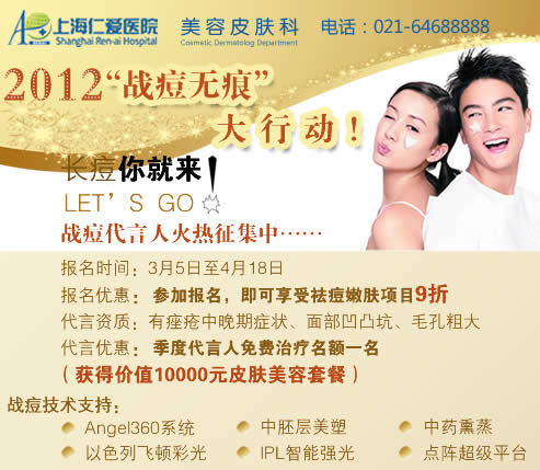 上海2012年3月14日電 /美通社亞洲/ -- 近日,上海仁愛醫院推出2012“戰痘無痕”大行動,現正火熱征集代言人,成功當選者即可享受全程免費祛痘和修復治療。想要成為美麗戰痘士?快來參加吧!