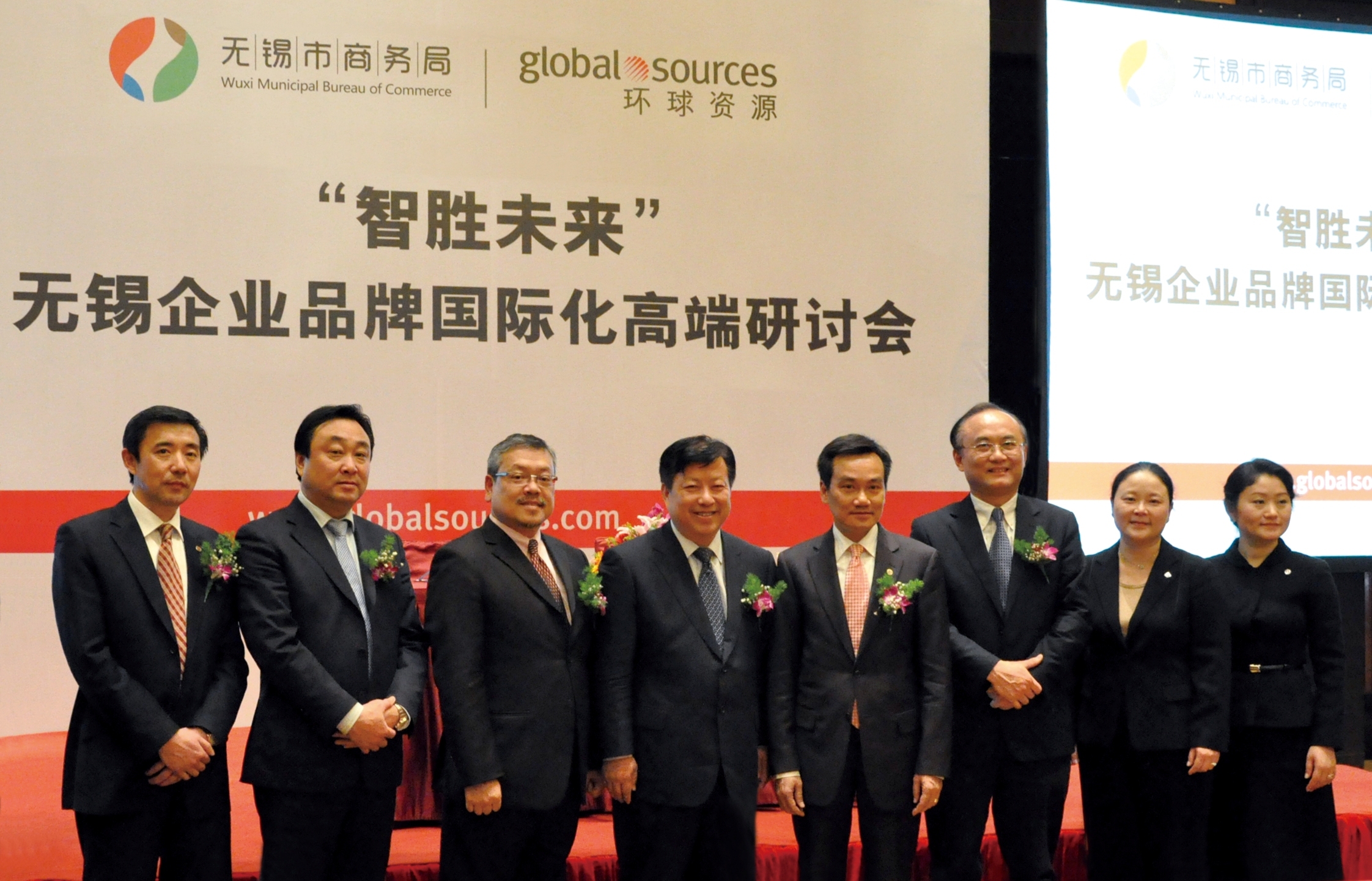 無錫市人民政府副市長方偉(左四)、無錫市商務(wù)局局長王學芯(左二)、無錫市商務(wù)局副局長張建(右三)與環(huán)球資源首席執(zhí)行官區(qū)乃光(右四)及其他嘉賓在“無錫市商務(wù)局與環(huán)球資源戰(zhàn)略合作簽約儀式”暨“‘智勝未來’無錫企業(yè)品牌國際化高端研討會”上合影