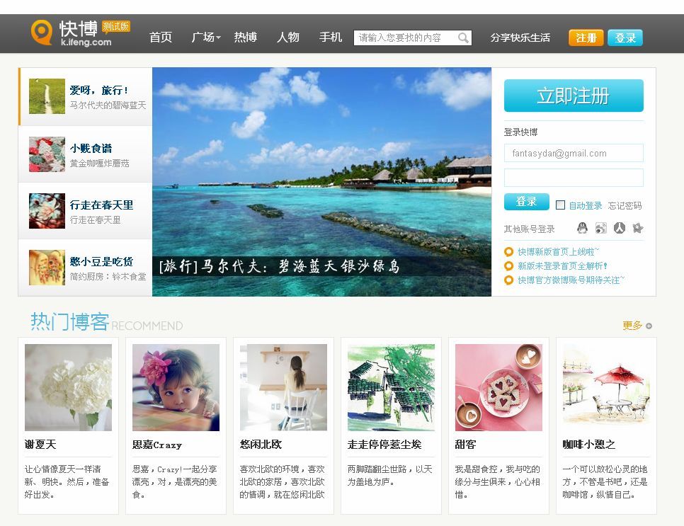 目前,國(guó)內(nèi)輕博客市場(chǎng)剛剛起步,作為市場(chǎng)搶先者,鳳凰網(wǎng)早在去年便推出鳳凰快博,試水輕博客運(yùn)營(yíng),搶得市場(chǎng)先機(jī)。經(jīng)過(guò)近一年的積累,鳳凰快博已經(jīng)形成了旅行、美食、購(gòu)物等幾大優(yōu)勢(shì)興趣圈組。改版后的鳳凰快博在更加注重內(nèi)容精品化的基礎(chǔ)上,全面提升了用戶體驗(yàn),在分享性和生活化方面均有極大改進(jìn),為用戶獲取信息、表達(dá)態(tài)度提供更大的便利。而此次與騰訊、新浪、開(kāi)心、人人等幾大強(qiáng)勢(shì)合作伙伴的賬戶貫通,更是簡(jiǎn)化了用戶登陸流程,方便了用戶的多平臺(tái)信息共享,為鳳凰快博快速增加用戶提供了保證。