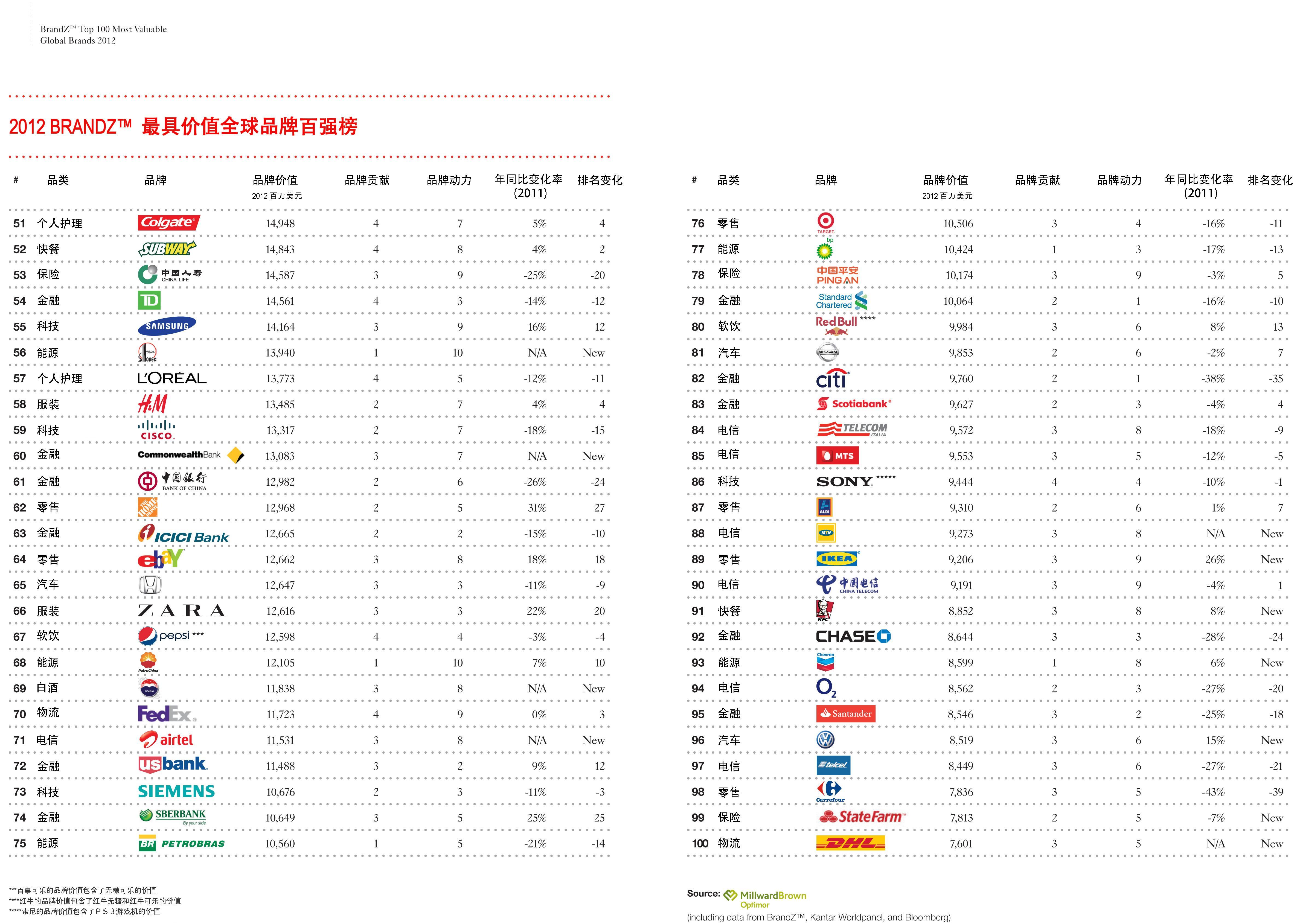 BrandZ 最具價值全球品牌百強調查不僅對財務數據、市場估價、分析報告和風險預測進行了縝密的分析,而且還考慮了消費者的意見,這在全世界可謂絕無僅有。調查報告在互聯網上發布,內容包括全球主要地區和 13 個市場領域的最具價值品牌排名結果及分析。單擊此處下載完整的 BrandZ 排行榜,其中包括地區和類別細分排名。排行榜及其他相關信息還通過免費的蘋果及安卓交互式應用程序或iPad 雜志提供。