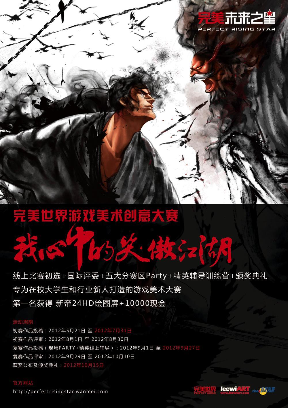 本次比賽是由完美世界主辦,leewiART 國際數(shù)字圖形藝術(shù)推廣機構(gòu)與智聯(lián)招聘共同承辦的藝術(shù)活動。本次活動面向在校大學生和剛工作不久的美術(shù)從業(yè)者,希望創(chuàng)作者可以本著開放、自由、創(chuàng)造性的精神,并通過自身對于笑傲江湖文化的理解,創(chuàng)作出屬于自己的江湖世界,作品最終以插畫的形式體現(xiàn),風格不限。比賽官方網(wǎng)站(http://perfectrisingstar.wanmei.com),比賽官方新浪微博(http://weibo.com/perfectrisingstar),比賽官方騰訊微博(http://t.qq.com/perfectrisingstar)也將在比賽啟動日同期上線。