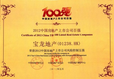 寶龍地產(HK.1238)榮獲2012中國大陸在港上市房地產公司“綜合能力TOP 10”、“財富創造能力TOP 10”、“財務穩健性TOP 10”
