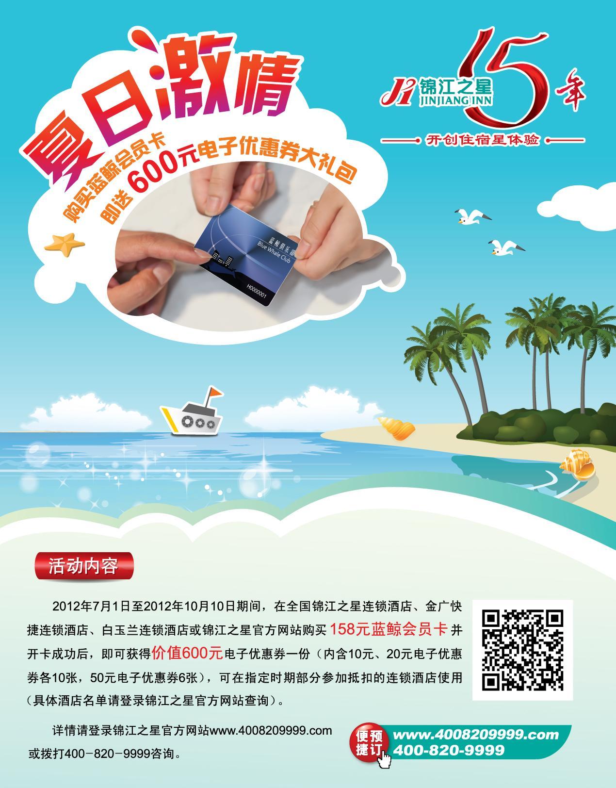 “夏日激情”活動時間為2012年7月1日至10月10日,在此期間,凡在全國范圍內所有已開業的錦江之星、金廣快捷和白玉蘭酒店前臺購買,或登錄錦江之星官網 www.4008209999.com 在線購買藍鯨會員卡,開卡成功后,系統自動短信提示,可獲贈價值600元的電子優惠券(電子優惠券內含10元抵扣券×10張,20元抵扣券×10張,50元抵扣券×6張,電子抵扣券使用期均為2012年11月1日-2013年3月31日),新會員可根據短信提示登陸系統獲得電子優惠券的使用權。該券可在會員價的基礎上每間夜再享受抵扣。除了錦江之星的藍鯨會員卡外,交通銀行辦理的錦江之星聯名卡,也可參加此次活動。