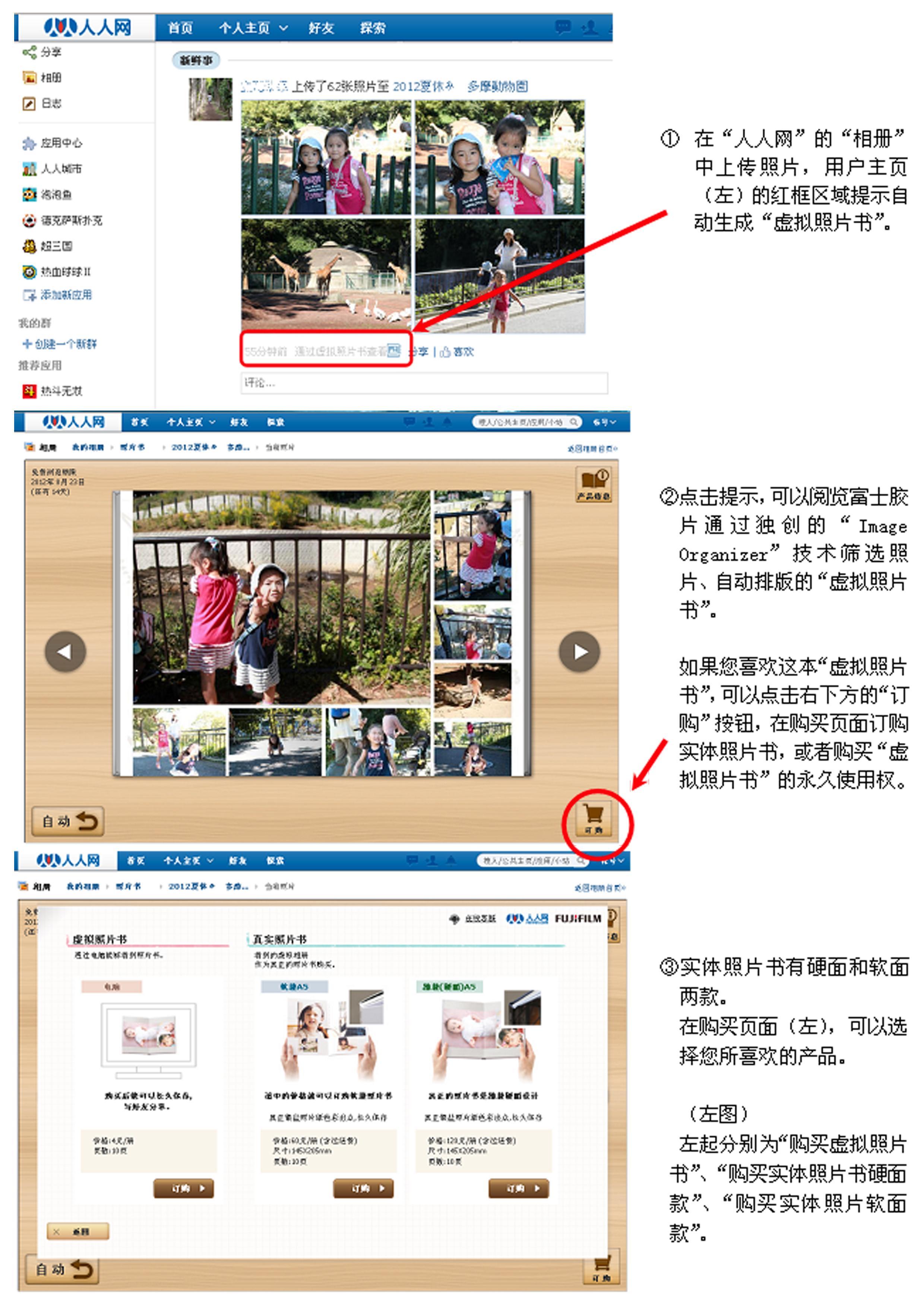 富士膠片此次與人人網合作,將公司獨有的照片解析技術“Image Organizer”運用進了人人網中,用戶如果在“人人網”的相冊頁一次上傳30張以上照片,就能在“人人網”網頁自動生成1本頁數為10頁、可供網絡瀏覽的“虛擬照片書”[3]。