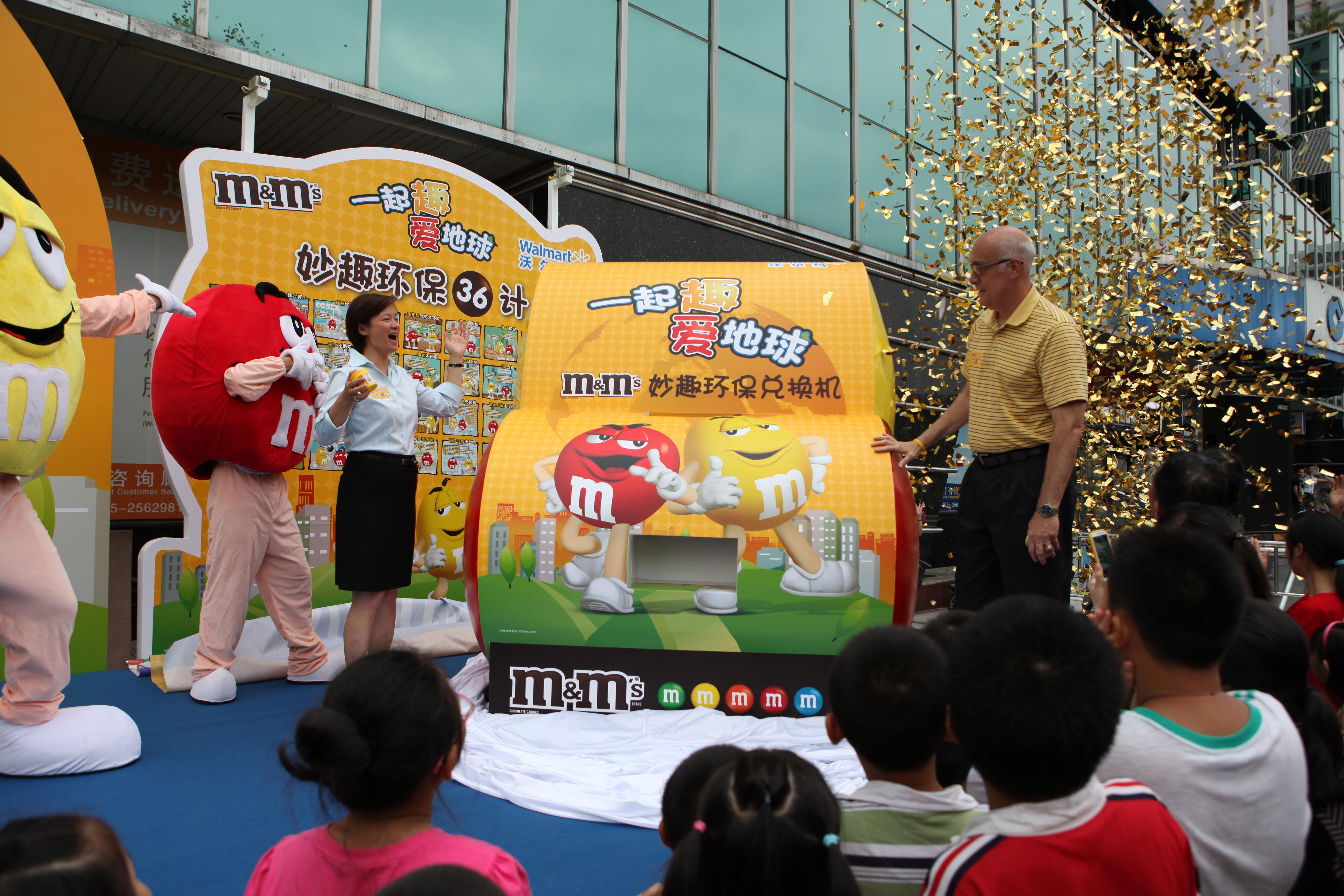 在啟動儀式上,活動環(huán)保大使m&m's的紅豆黃豆不僅帶來了別開生面的環(huán)保主題情景劇,更把妙趣環(huán)保兌換機(jī)帶到現(xiàn)場,邀請?jiān)趫黾钨e以及顧客投進(jìn)m&m's巧克力的包裝材料來兌換利用廢舊塑料制作而成的環(huán)保杯或環(huán)保袋,以鼓勵消費(fèi)者身體力行地參與到環(huán)保活動中。