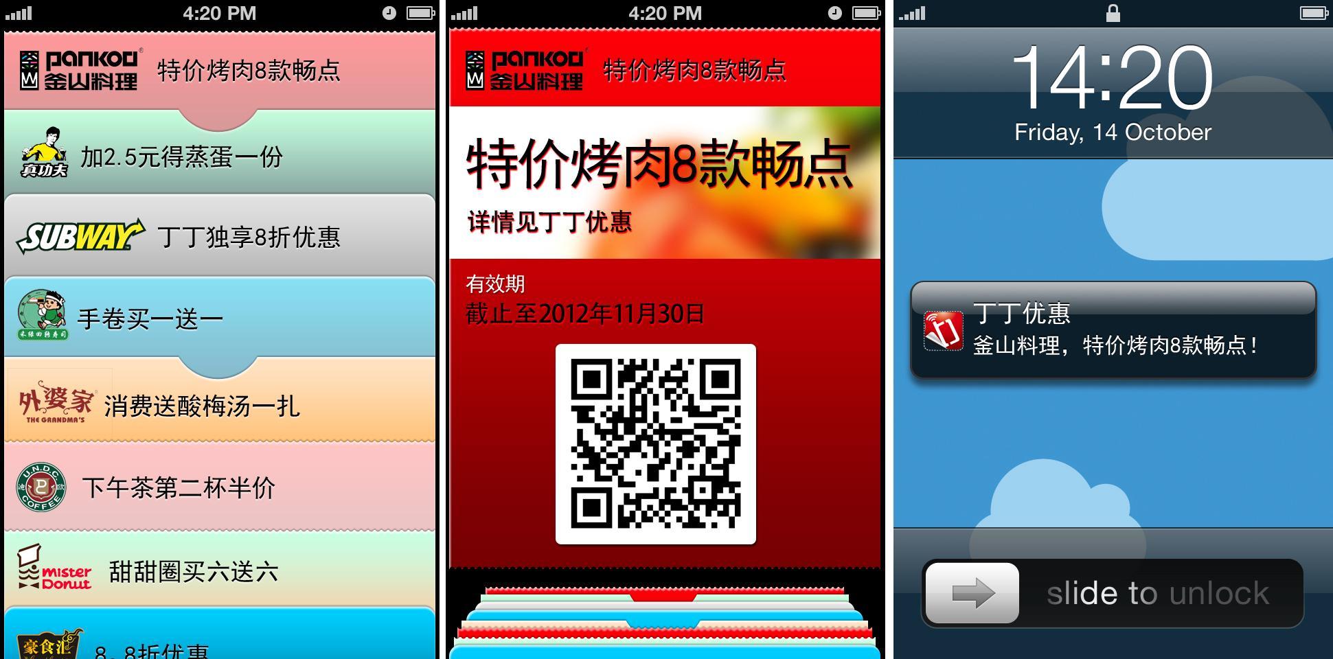 值得一提的是,丁丁優(yōu)惠還將支持Passbook的“到店提醒”功能。用戶在完成收藏優(yōu)惠券到Passbook的動(dòng)作后,優(yōu)惠券的地理位置信息也一樣被同步,一旦用戶到達(dá)所收藏優(yōu)惠券商戶所在地附近時(shí),Passbook的LBS功能將在鎖屏狀態(tài)下,溫馨地提醒用戶使用 -- 記得在消費(fèi)時(shí)享受優(yōu)惠。