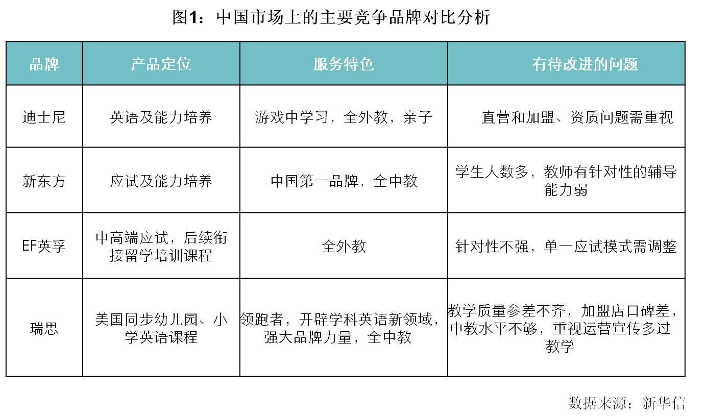 經過十多年的發展,我國的少兒英語培訓各種品牌的市場定位也越來越清晰,由此可以看出,市場細分將成為今后少兒英語培訓的一個發展趨勢。在這個市場上,有依托原有品牌,逐步向少兒培訓領域擴張的新東方、英孚,亦有同迪士尼一樣,由國際教育巨頭“空降”中國的瑞思學科英語。這塊“蛋糕”的爭奪戰,已經愈演愈烈。教育巨頭營銷理念全方位“博弈”,中國市場上主要的競爭品牌對比分析如下(圖1):