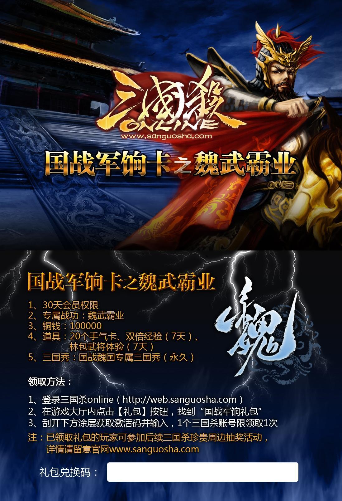每套《三國殺—國戰》中都有一張國戰軍餉卡,刮開涂層獲取激活碼,登陸《三國殺OL》官網激活后,即可領取“國戰軍餉禮包”,豐厚的線上獎勵助玩家成為《三國殺OL》達人。禮包包括:30天會員權限,專屬戰功,100000銅錢,20張手氣卡,雙倍經驗(7天),林包武將體驗(7天),永久國戰三國秀。值得一提的是,魏,蜀,吳,群雄四股勢力都有各自不同的專屬戰功和國戰三國秀。