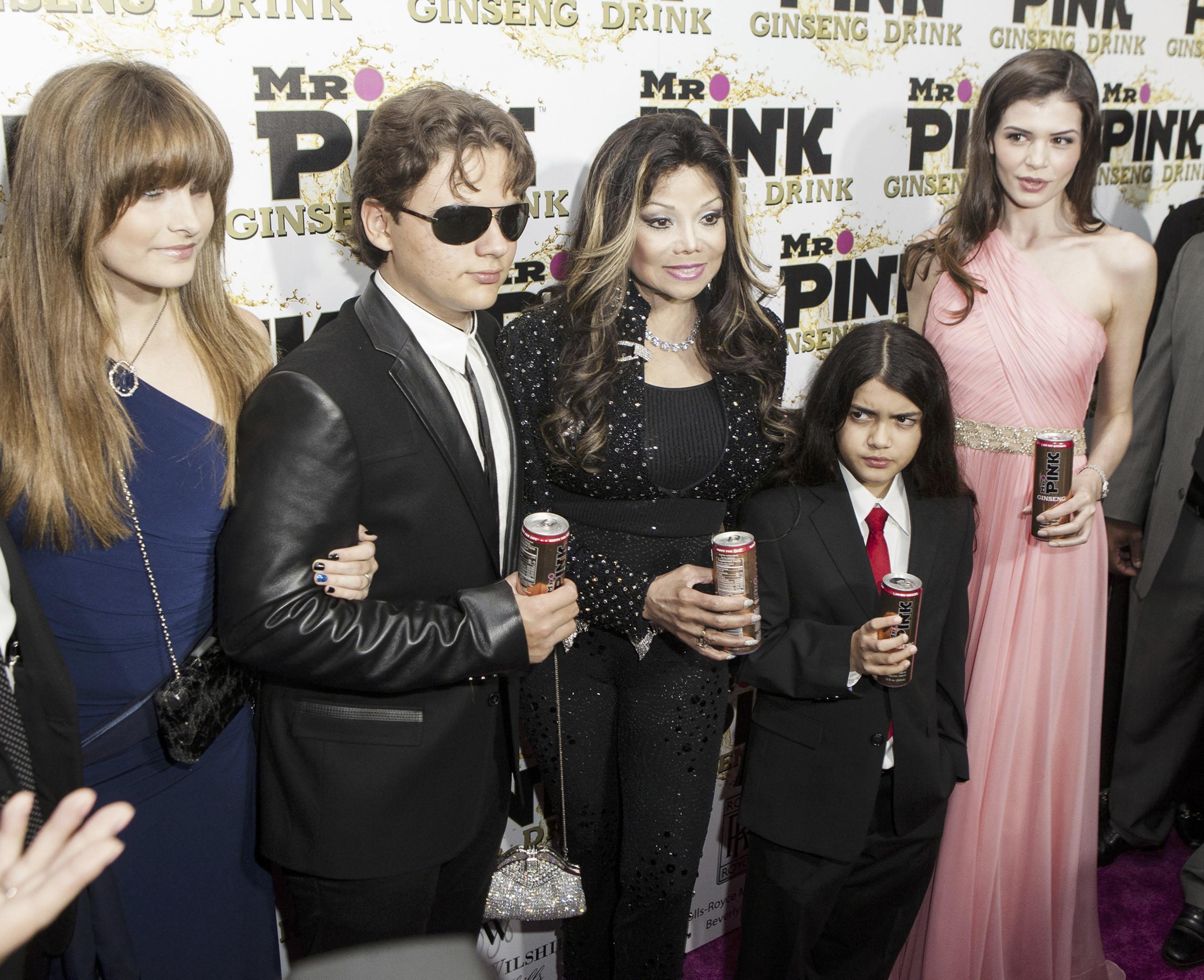 10月11日晚,比弗利威爾謝麗晶酒店明星薈萃,好萊塢大腕、職業運動員和音樂人悉數到場,為Mr. Pink Ginseng Drink最新健康飲品的發布助威。杰克遜的三個孩子普林斯、帕里斯和布蘭基特也在姑媽拉托亞的陪同下走上了紅地毯。
