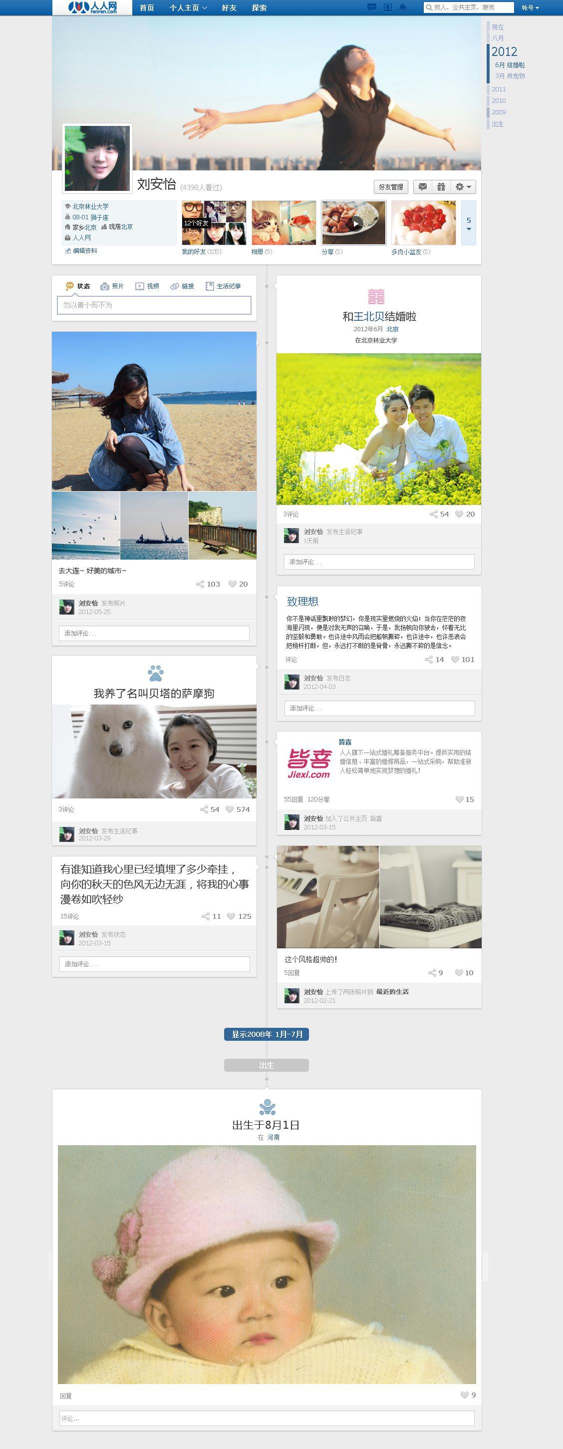 人人時間軸的推出讓人人網(wǎng)個人主頁有了全新的展現(xiàn)形式,用戶可以通過自定義封面、添加生活紀事、記錄足跡等功能,在人人網(wǎng)上記錄自己從出生那一天起的人生軌跡。不僅如此,人人時間軸還會將用戶在人人網(wǎng)上發(fā)布的所有內(nèi)容按照時間順序重新排布,無論是出生還是結(jié)婚,戀愛或是旅行,人人時間軸都會用最精致的展現(xiàn)方式賦予每一位用戶獨特的故事,真正實現(xiàn)了一樣的時間,不一樣的時間軸。與此同時,人人時間軸簡約清爽的頁面風(fēng)格也與人人網(wǎng)首頁保持了一致。