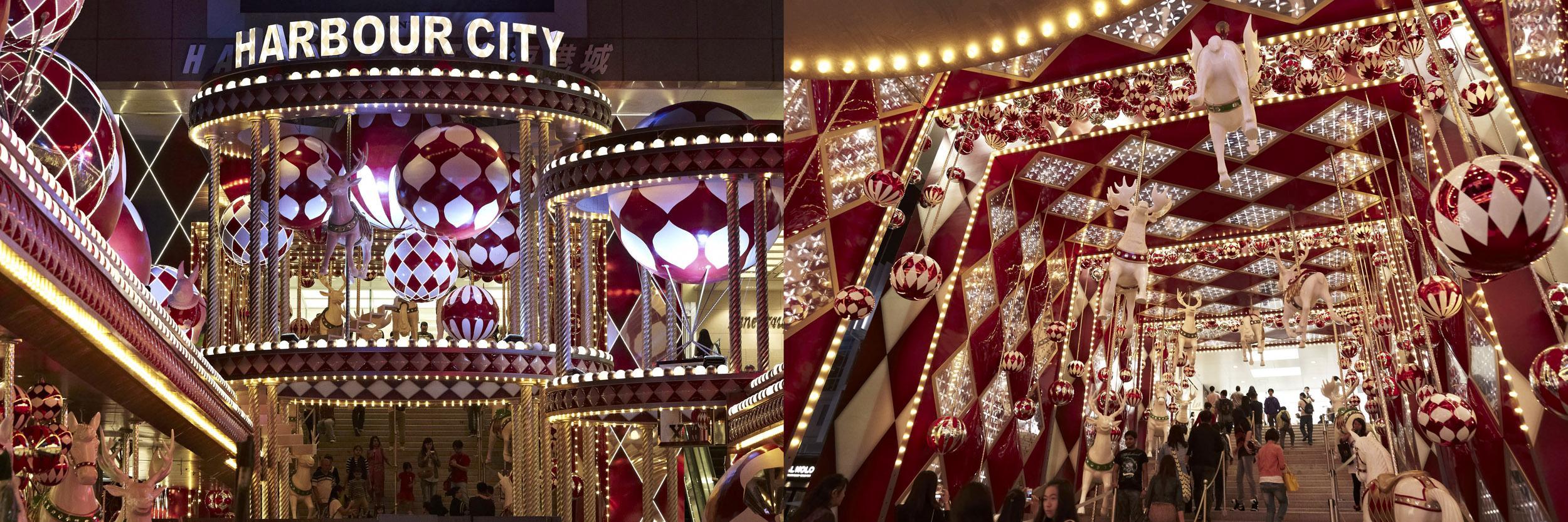 海港城今年的圣誕主題為“圓滿愛”,海港城海運(yùn)大廈露天廣場(chǎng)的圣誕布置以“旋轉(zhuǎn)木馬”和“夢(mèng)幻馬戲團(tuán)”為設(shè)計(jì)概念。整個(gè)裝飾長(zhǎng)達(dá)50米,從五枝旗桿伸廷至海港城海運(yùn)大廈正門入口,并首次把廣場(chǎng)兩旁全面布置。