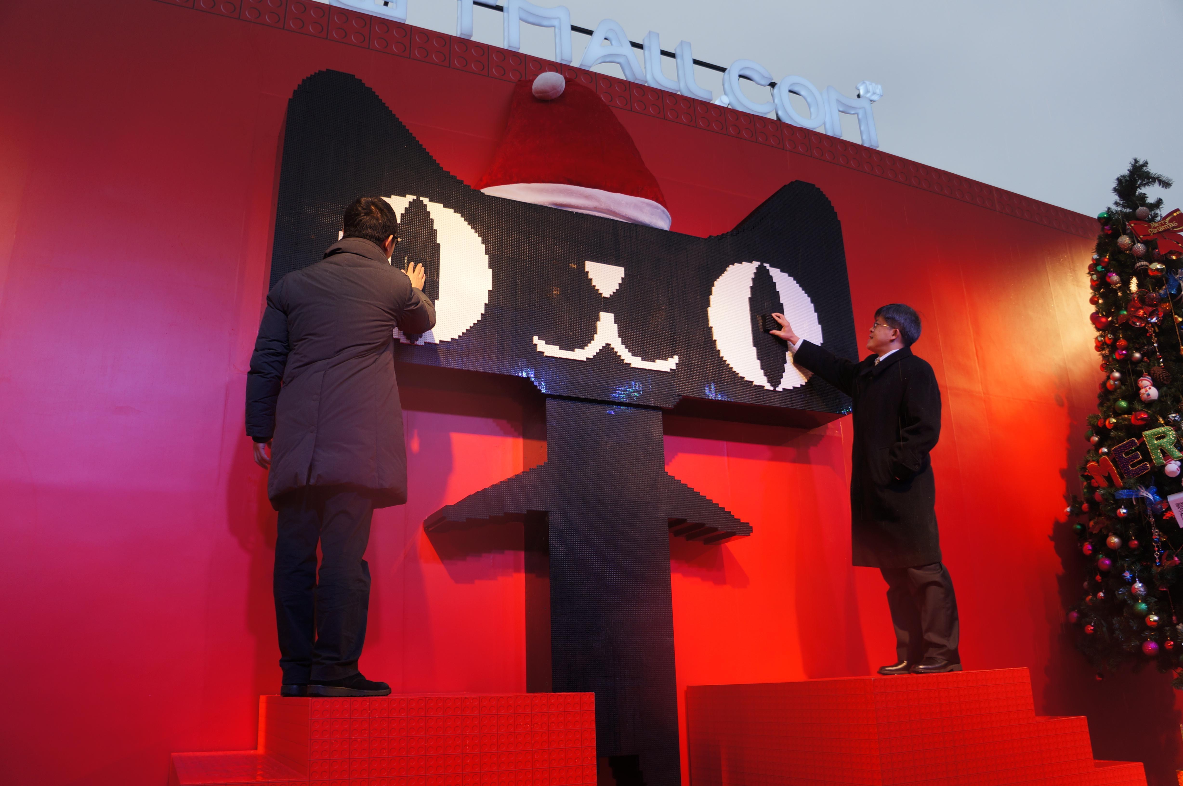 樂高中國區域總監任啟枝和天貓副總裁王煜磊共同啟動樂高天貓圣誕點亮儀式。在杭州市吳山廣場上一座高達3.5米的樂高天貓被正式點亮。這是由樂高專門從丹麥空運來的50000塊黑白色特制積木搭建而成,樂高粉絲及天貓達人共同見證了這場“積木秀”