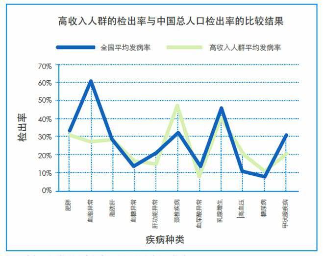 中國高收入人群的平均檢出率與中國總?cè)丝谄骄鶛z出率的比較結(jié)果為肥胖、血脂異常、肝功能異常、血尿酸異常、乳腺增生、甲狀腺疾病的檢出率均高于中國全人口檢出率。而脂肪肝、血糖異常、糖尿病的檢出率接近中國全人口檢出率。此外高血壓、頸椎病的檢出率則低于中國全人口檢出率。