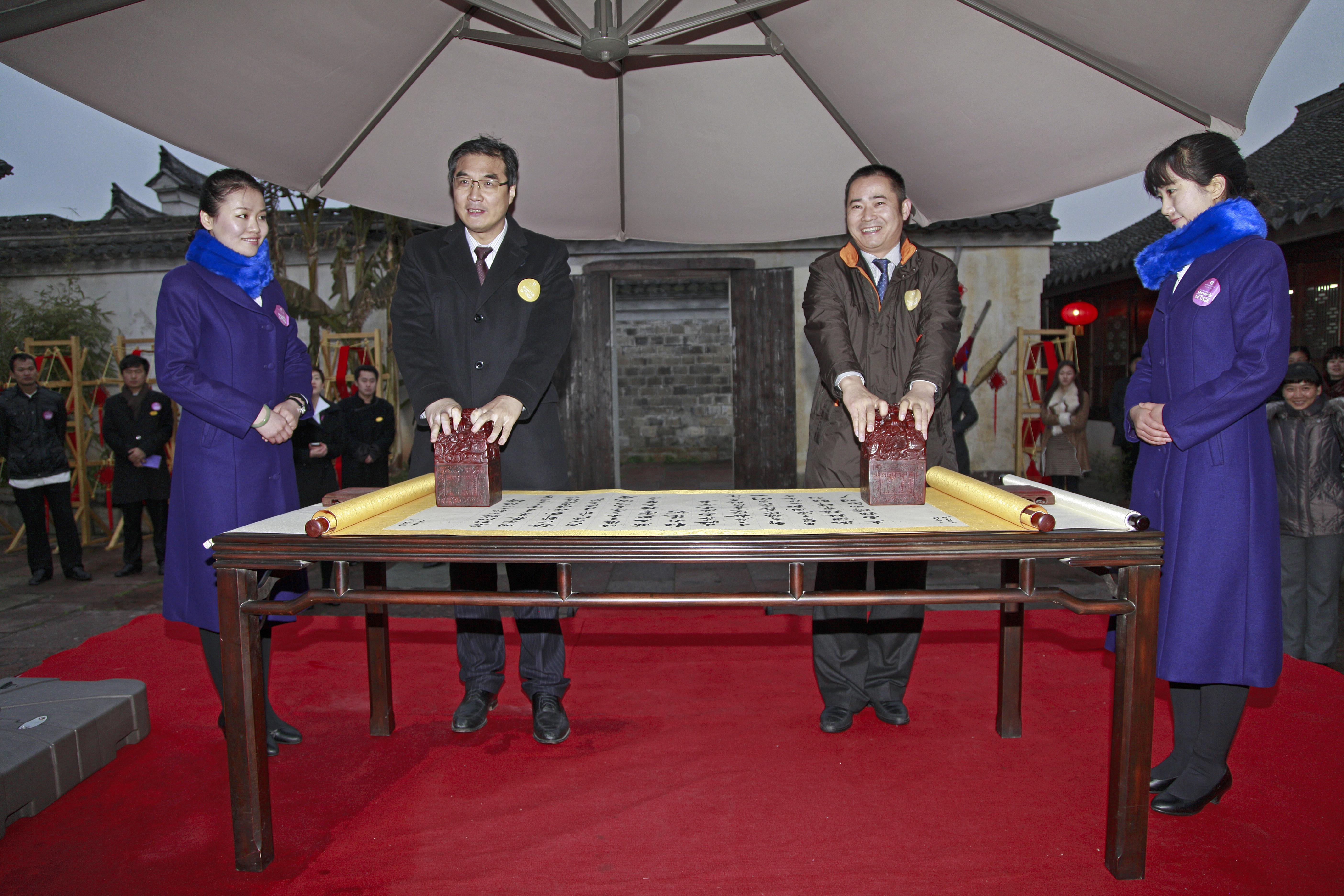 鎮海區副區長王兆波和開元旅業集團總裁陳燦榮分別代表各方在現場簽了約。最后,鎮海區委書記薛維海和開元旅業集團董事長陳妙林一起走上龍鳳臺,為掛在臺梁柱上的大紅綢結彩,寓示兩家成功“聯姻”。