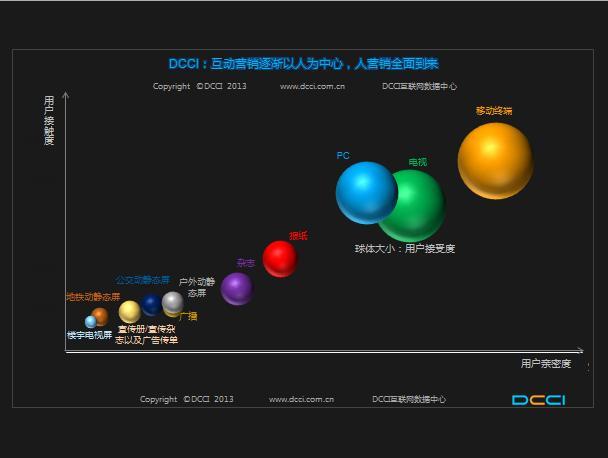 DCCI在Adworld期間發布的數據顯示:互聯網在2013年前后,以規模、份額等關鍵指標,終于成為主流化媒體,網絡廣告營銷市場2013年有望達到1033億元的規模,2014年超越電視成為第一屏、第一終端、第一媒體、第一營銷通路。