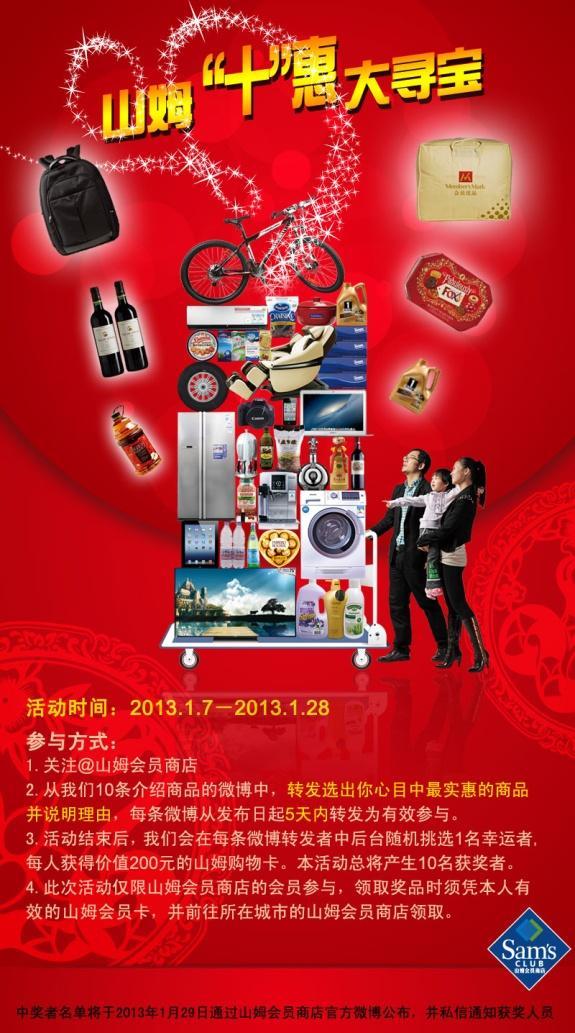 1月7日至28日,山姆會員商店官方微博@山姆會員商店將發(fā)出10條介紹商品的微博,山姆會員只需關注@山姆會員商店 ,從這10條微博中轉發(fā)選出心目中實惠的商品并說明理由,就可以參與抽獎。每條微博從發(fā)布日起5天內(nèi)轉發(fā)為有效參與,活動結束后,山姆會員商店會在每條微博轉發(fā)者中后臺隨機挑選10名幸運山姆會員,每人獲得價值200元的山姆購物卡。中獎者名單將于1月29日通過@山姆會員商店公布,并私信通知獲獎人員。