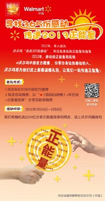 1月16日春節前夕,@沃爾瑪中國官方微博發起了“尋找365份感動,傳遞2013正能量”微公益活動,號召網友和顧客在新的一年中尋找、創造更多“感動”,發現更多社區好人。與此同時,沃爾瑪員工志愿者也給那些正能量故事的主人公們以及那些需要幫助的人,比如無法回家過年的外來務工人員、“空巢老人”等,送上一份暖融融的心意。