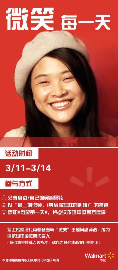 3月12日至22日,@沃爾瑪中國官方微博將開啟第一個小行動“微笑每一天”,號召人們每天給自己和身邊人多一次微笑,為日常生活增添一份友好和積極的態(tài)度。3月12日至3月14日期間,消費者可以用#微笑每一天#話題標簽,將自己或身邊人的笑臉照片和心情分享至新浪微博,將有機會入選沃爾瑪“最美的微笑”網絡評選,成為沃爾瑪微笑代言人。