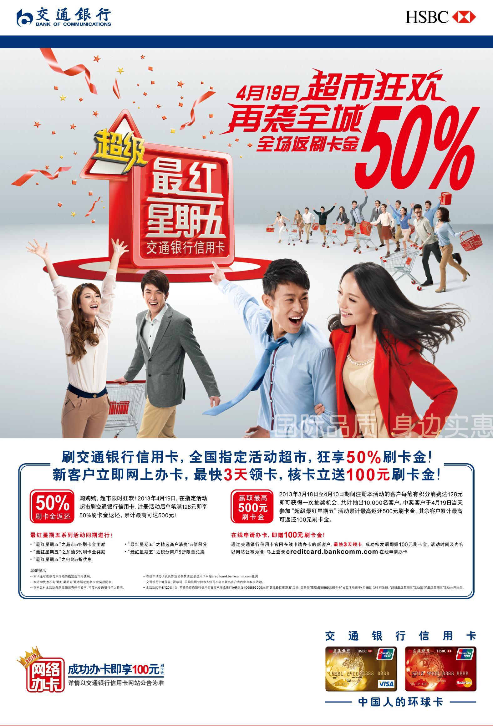 上海2013年3月19日電 /美通社/ -- 自“超級最紅星期五”去年創(chuàng)下單日消費總額20億元的紀錄后,4月19日,交通銀行信用卡“超級最紅星期五”將全民狂歡,再襲全城!屆時,交通銀行信用卡將攜手全國3000家超市,為持卡人提供全場返50%刷卡金的優(yōu)惠盛宴,較高500元。這場專屬交通銀行信用卡用戶的購物盛宴,勢必將掀起“五一”長假前第一波“暢刷”狂潮。
