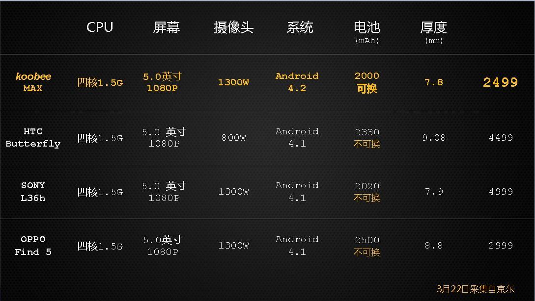 koobee 四核旗艦MAX在發布會上公布售價為2499元,京東活動預定期間,下單立減200元,售價只需2299元。這也是目前小編得知的較低價格5寸1080p四核旗艦機型,直接秒殺了傳說中性價比之王的“小米2”。而以2499元的售價來看,koobee MAX也是目前市場上在售機型中性價比較高的四核1080p手機。