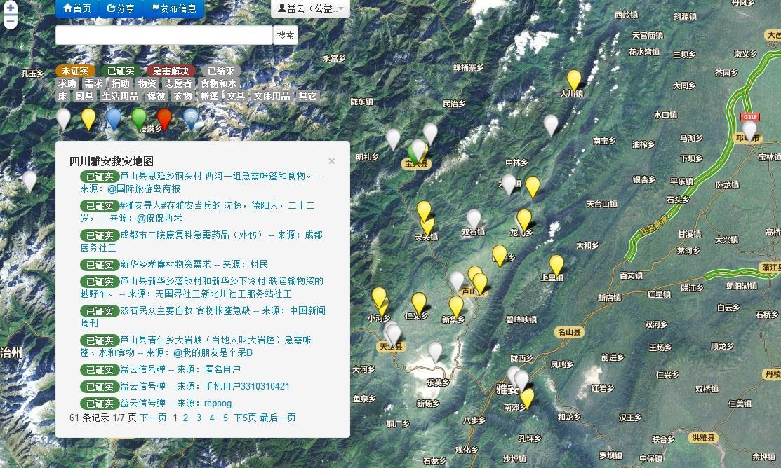 在雅安7.0 級大地震的震后救援中,在有限的對外通訊過程中無法即時有效的傳達(dá)救助信息,或會使災(zāi)區(qū)面臨救援及求援等信息無法完整、有效地傳遞到災(zāi)區(qū)之外,益云雅安地震救災(zāi)地圖方便災(zāi)區(qū)及外界對于災(zāi)區(qū)救援/求援信息的傳達(dá)、確認(rèn)及消息確認(rèn)后的及時響應(yīng)行。