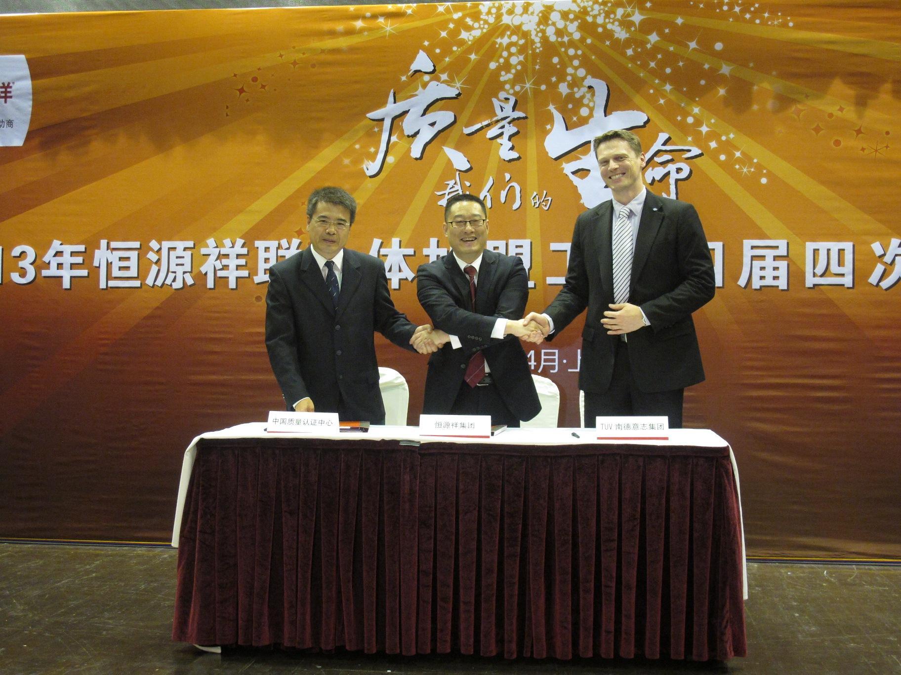 上海2013年4月24日電 /美通社/ -- 2013年4月6日,TUV 南德意志大中華集團 (以下簡稱TUV SUD ),中國質(zhì)量認證中心(以下簡稱CQC)與恒源祥(集團)有限公司(以下簡稱恒源祥)成功簽署了質(zhì)量管理體系審核戰(zhàn)略合作協(xié)議。合作三方將本著“戰(zhàn)略互利,合作共贏”的原則,在恒源祥集團質(zhì)量管理體系審核等方面開展全面合作。TUV南德意志大中華集團高級副總裁沃爾夫岡 . 徐貝爾(Mr. Wolfgang Hubl) 先生,中國質(zhì)量認證中心李國振副主任,恒源祥總經(jīng)理陳忠偉先生以及副總經(jīng)理奚錫先生出席簽約儀式。