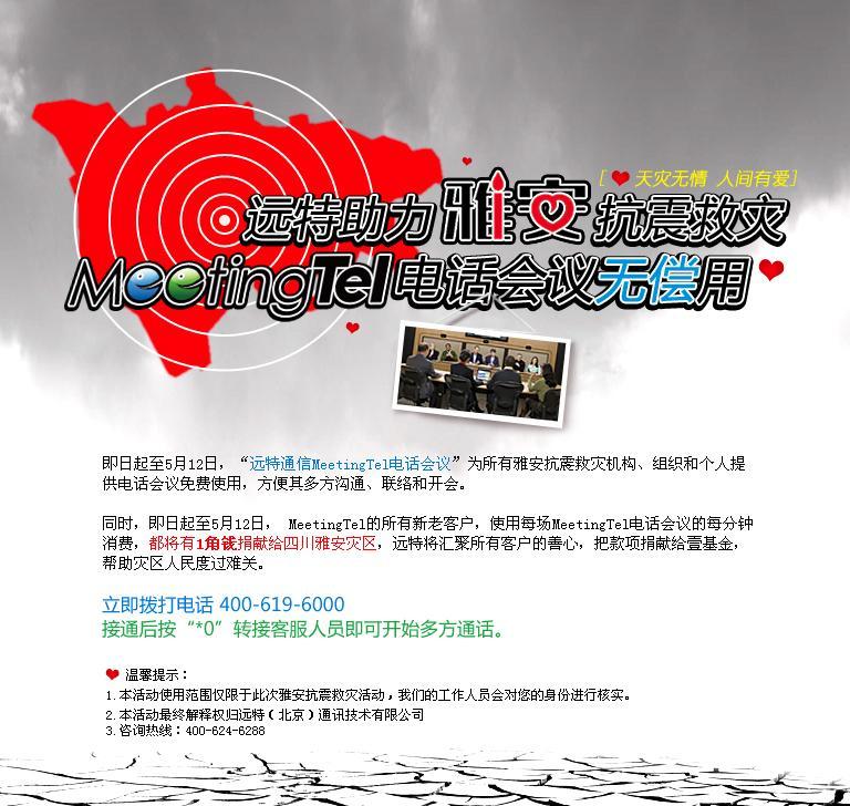 同時,即日起至5月12日,遠特通信電話會議 MeetingTel 的所有新老客戶,使用每場MeetingTel 電話會議的每分鐘消費,都將有1角錢捐獻給四川雅安災區,遠特將匯聚所有客戶的善心,把款項捐獻給壹基金,幫助災區人民度過難關。
