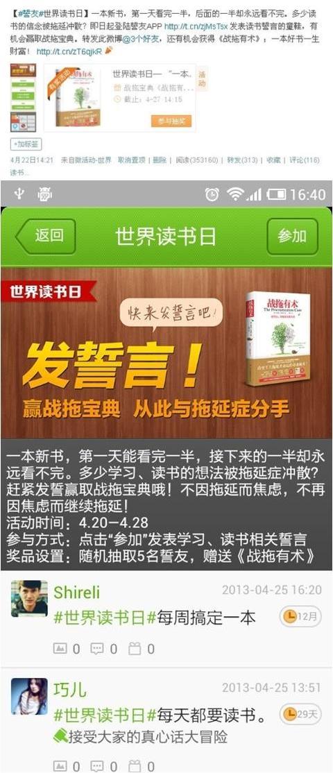 4月23日,《誓友》在手機平臺和官方微博雙雙推出“讀書日戰拖”主題線上活動http://event.weibo.com/824246 ,獎品是由含章行文提供的《戰拖有術》,得到了廣大網友的熱情參與,截止活動結束時,微博活動閱讀參與突破36萬次。