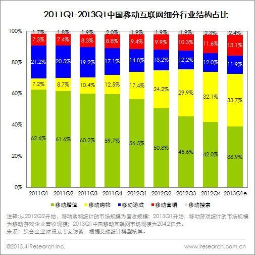 2013Q1由于假期的影響,移動互聯網整體增速有所降低,但是移動互聯網經過2011-2012年的高速發展已經到了關鍵性的一年。