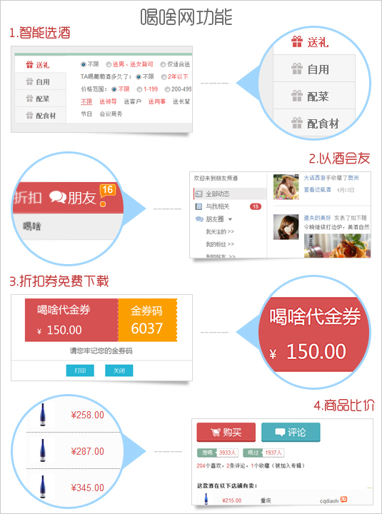 中國葡萄酒市場近年快速增長,預計2014年市場年總值將達到人民幣900億。然而,目前國內的葡萄酒相關網站主要是電商銷售主導,或以業(yè)內新聞報道為主的行業(yè)門戶。提供智能選酒推薦、單品價格比較、免費折扣券下載以及圖片分享、朋友圈社交等功能的網站卻缺乏。喝啥網填補了這方面的空白。