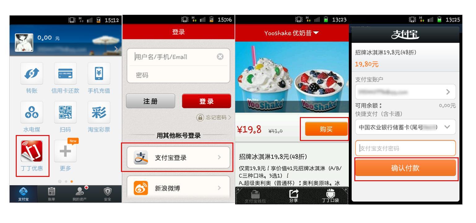 丁丁優惠(@丁丁優惠-手機優惠券)新版本在打通支付寶賬戶體系后,用戶可以選擇用支付寶賬號登陸,只需通過手機即可完整地完成“線上購買線下兌現”的移動消費體驗,從獲取優惠券到手機支付到最終的驗證。其中支付的過程將直接調用支付寶賬戶信息進行快捷支付,更方便也更安全,不再需要借助銀行卡、會員卡、現金等其他方式。