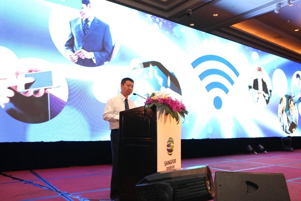 深信服產(chǎn)品技術(shù)總監(jiān)殷浩為來賓揭曉的,則是深信服今年發(fā)布的另一款重磅新產(chǎn)品 -- 企業(yè)級無線產(chǎn)品。與揭曉秘密的機(jī)器人小i的有趣互動(dòng),引來現(xiàn)場來賓的陣陣笑聲。深信服企業(yè)級Wlan解決方案的優(yōu)勢也在他的生動(dòng)、專業(yè)的講解中,清晰的呈現(xiàn)出來。